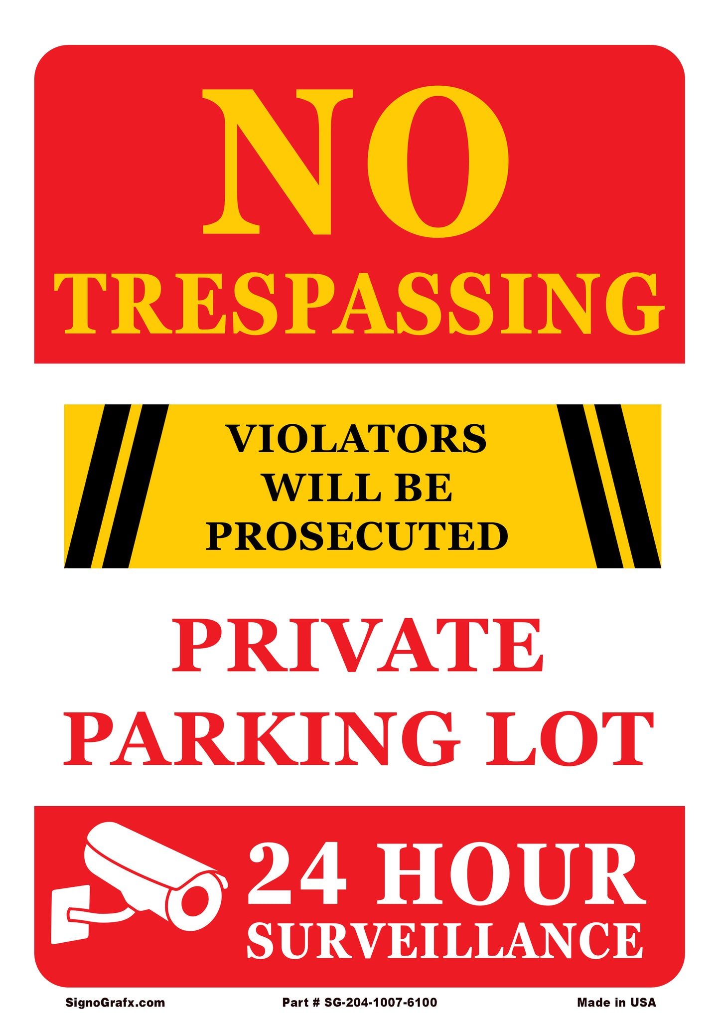 No trespassing. Violators will be prosecuted. Private parking lot under 24-hour surveillance sign.