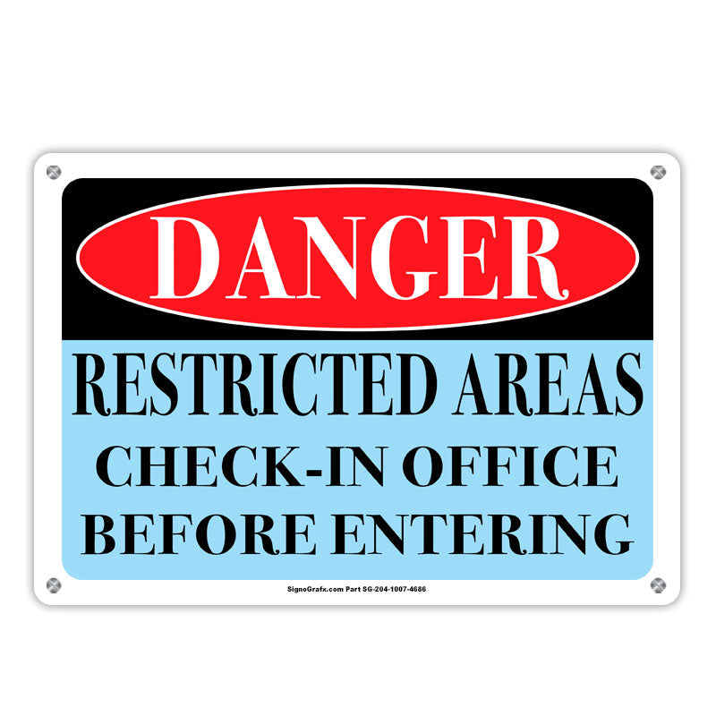 Danger Restricted Areas Check-In Office Before Entering Sign