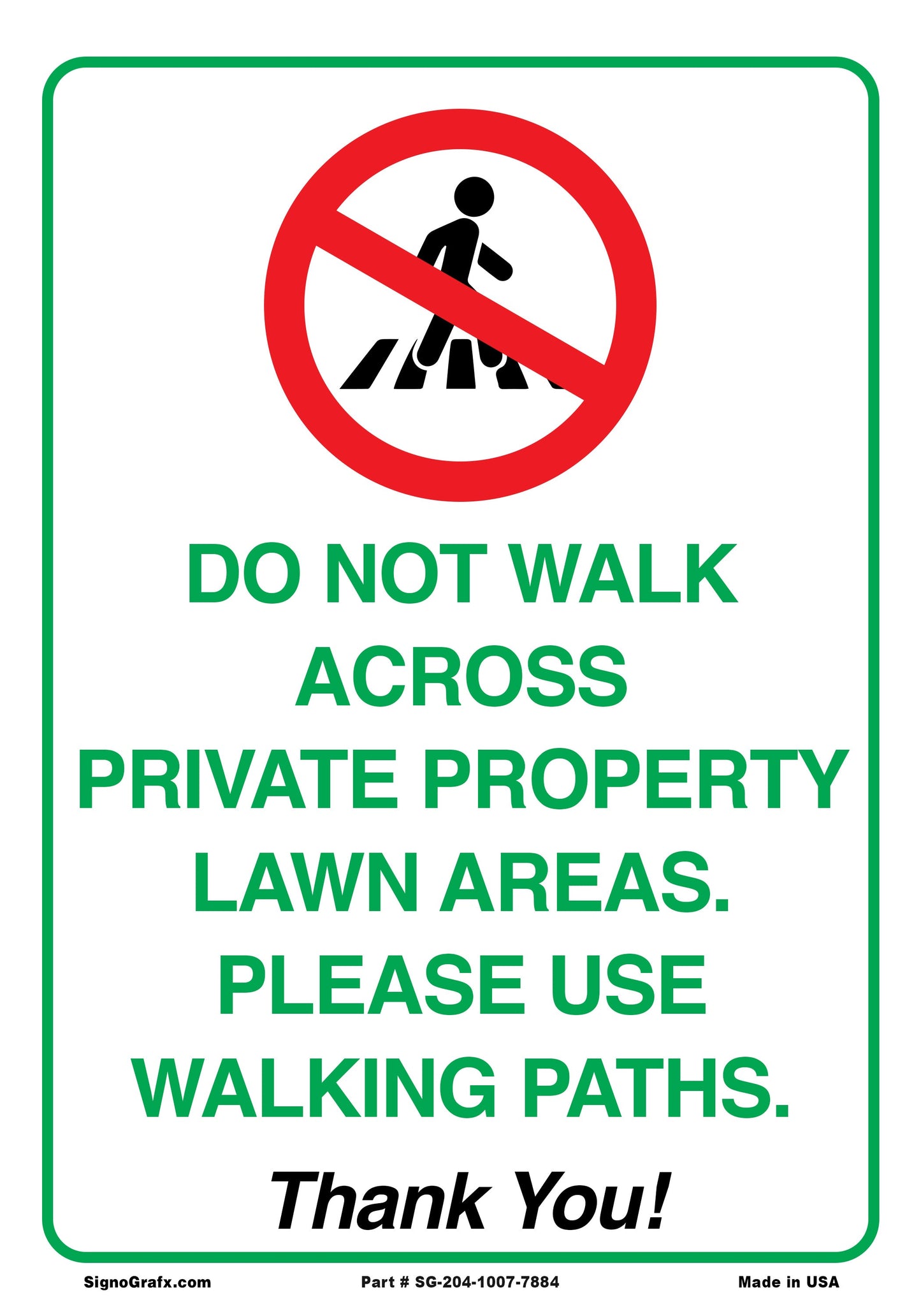 Do Not Walk Across Private Property Lawn Areas,Please Use Walking Paths Sign