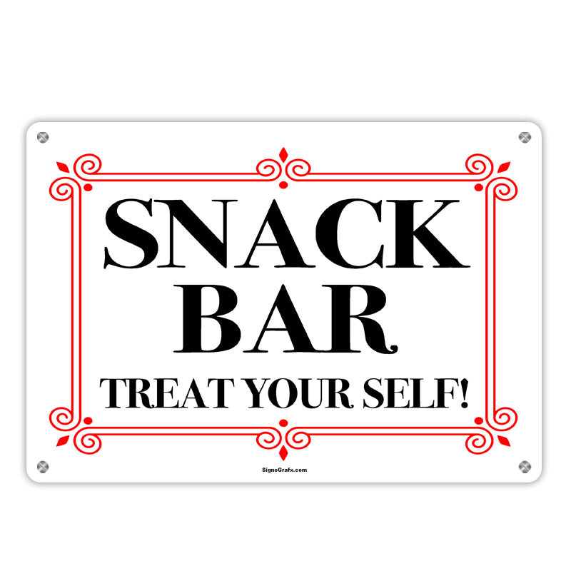 Metal: Constructed from high-quality Metal, this sign offers durability and weather resistance, making it suitable for outdoor installation in campground settings. Its professional finish ensures visibility and effectiveness in directing campers to the Snack Bar area.