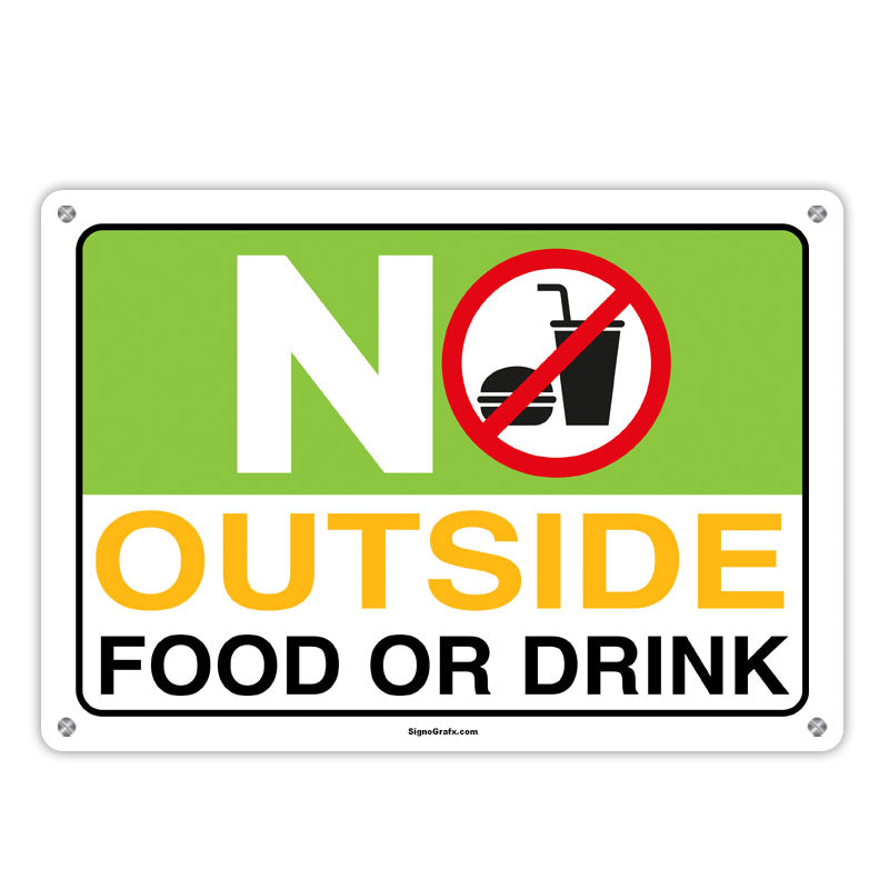 Maintain Cleanliness and Compliance with our "NO Outside Food OR Drink" Sign. This sign clearly communicates the policy prohibiting outside food and drink within your establishment, ensuring cleanliness and adherence to regulations. Available in three durable materials: