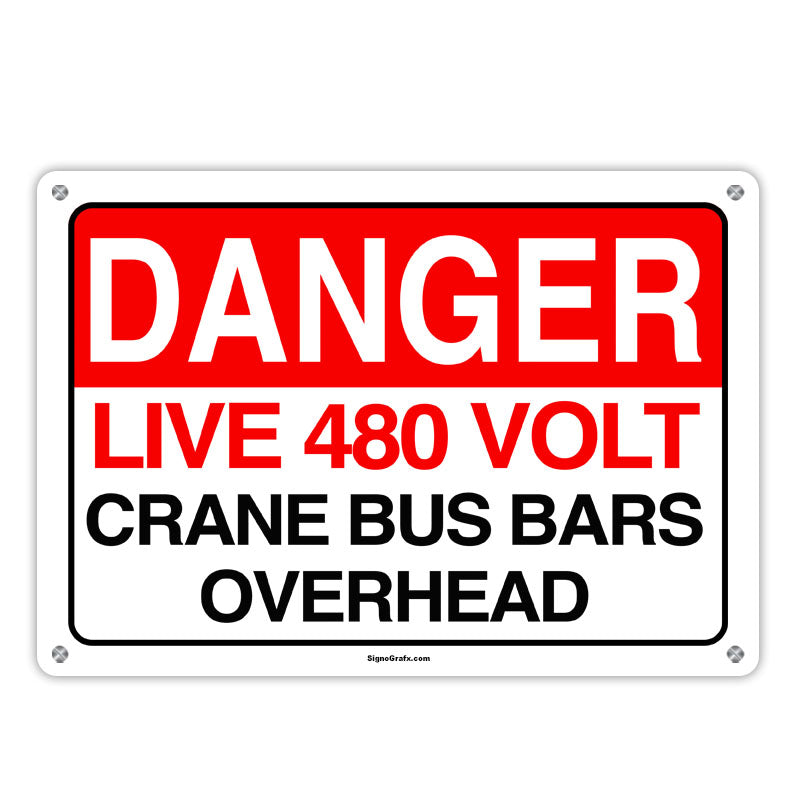 Introducing our OSHA Danger Sign: Live 480 Volt - Crane, Bus, Bars Overhead, designed to enhance safety awareness in industrial environments where there is a risk of electrical hazards. This sign features a clear warning message indicating the presence of live 480-volt electrical lines overhead, along with potential hazards such as cranes and bus bars. Available in three durable materials: