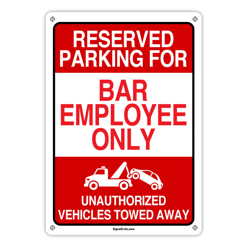 Introducing our "Parking Lot Sign: Reserved Parking For Bar Employee Only Unauthorized Vehicles Towed Away (With Tow Away Graphic)," designed to clearly designate parking spaces for bar employees and warn unauthorized vehicles of potential towing. This sign features a bold message along with a tow away graphic, ensuring visibility and effectiveness in communicating parking regulations. Available in three durable materials: