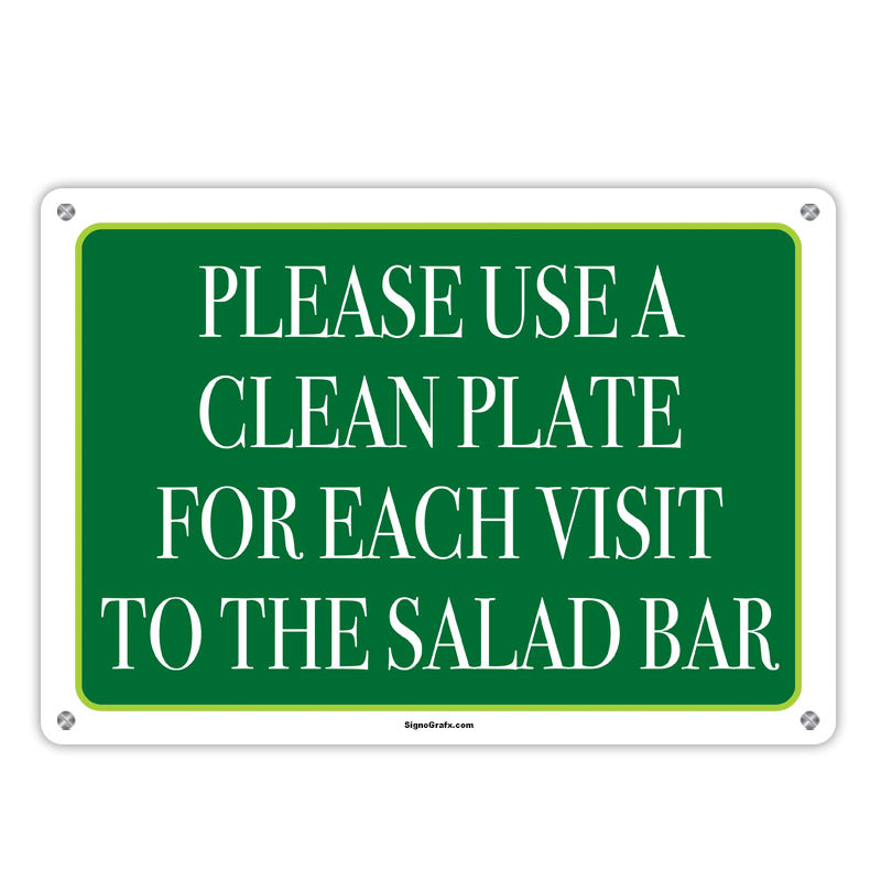 Metal: Crafted from premium Metal, this sign offers durability and weather resistance, making it suitable for both indoor and outdoor use. Its professional finish ensures visibility and effectiveness in reminding patrons to use a clean plate for each visit.