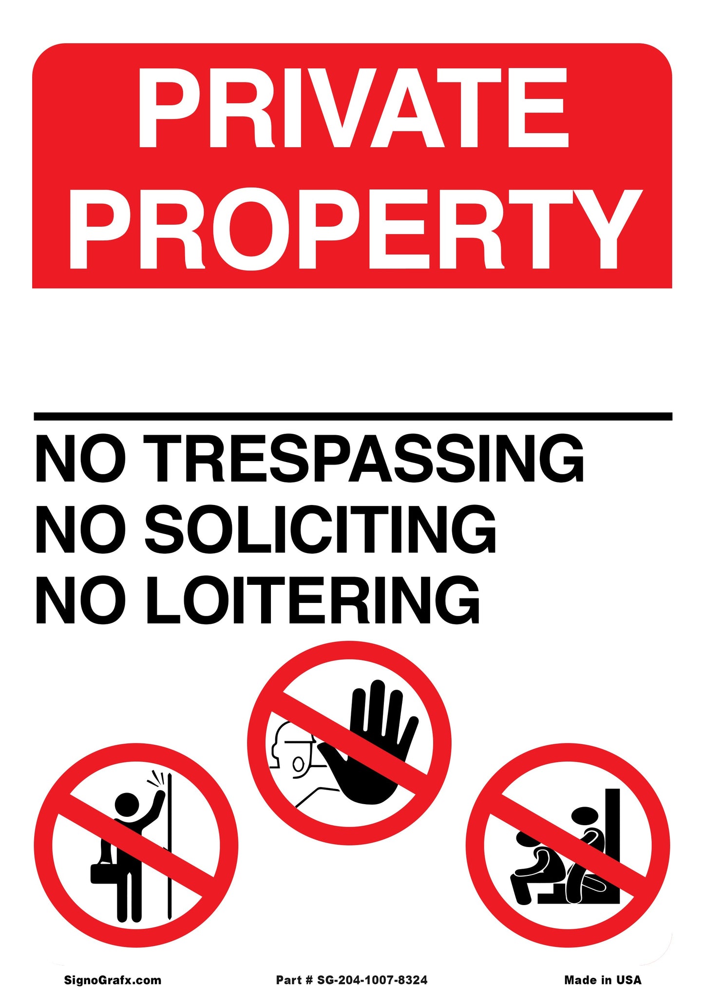 Private Property No Trespassing No Soliciting No Loitering Sign