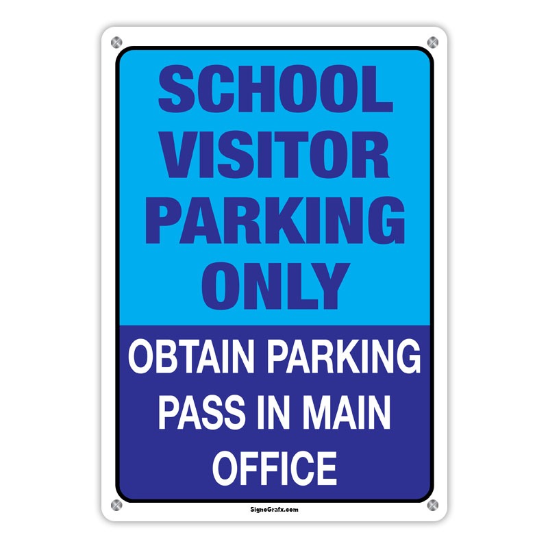 1. Metal: Crafted for durability and longevity, our Metal sign ensures a sleek and professional appearance, perfect for clearly designating parking for school visitors only and directing them to obtain a parking pass in the main office. Its weather-resistant properties guarantee visibility and effectiveness both indoors and outdoors.