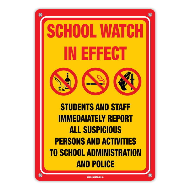 Enhance security with our 'School Watch In Effect' sign! This sign reminds students and staff to immediately report any suspicious activities, ensuring a safe school environment.