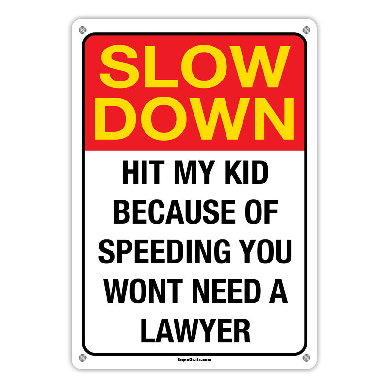 Promote caution with our 'Slow Down! Hit My Kid Because Of Speeding You Won't Need A Lawyer' sign! This sign serves as a bold reminder for drivers to reduce speed in areas where children are present.
