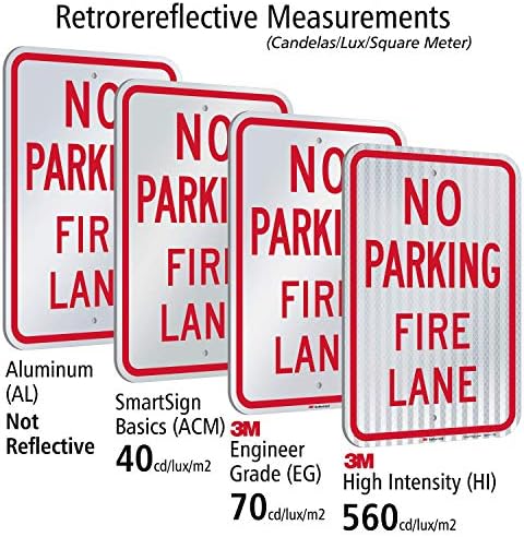 SMARTSIGN BASICS. No Parking Fire Lane Signs last up to 7 years outside, these signs have prismatic Engineer Grade film mounted on 120 mil thick ACM (Metal Composite Material) which has a thick Metal outer layer and a durable plastic core.