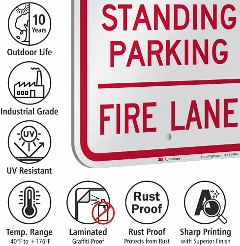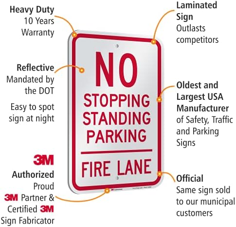 DURABLE Metal: 'No Stopping or Standing Fire Lane' signs are made of 63 mil thick heavy-duty rustproof reflective Metal that easily lasts 10 years outside and meets DOT road and traffic requirements.