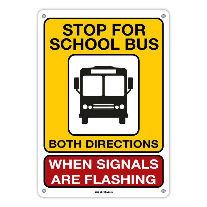 Ensure the safety of children with our 'Stop For School Bus Both Directions When Signals Are Flashing' sign! This sign serves as a vital reminder for drivers to halt their vehicles in both directions when a school bus is picking up or dropping off students.