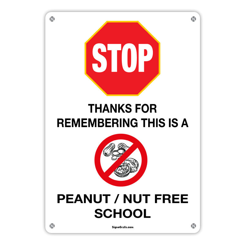 Ensure safety with our 'Stop Thanks For Remembering This Is A Peanut / Nut Free School' sign! This sign serves as a crucial reminder for everyone to maintain a peanut and nut-free environment within the school.